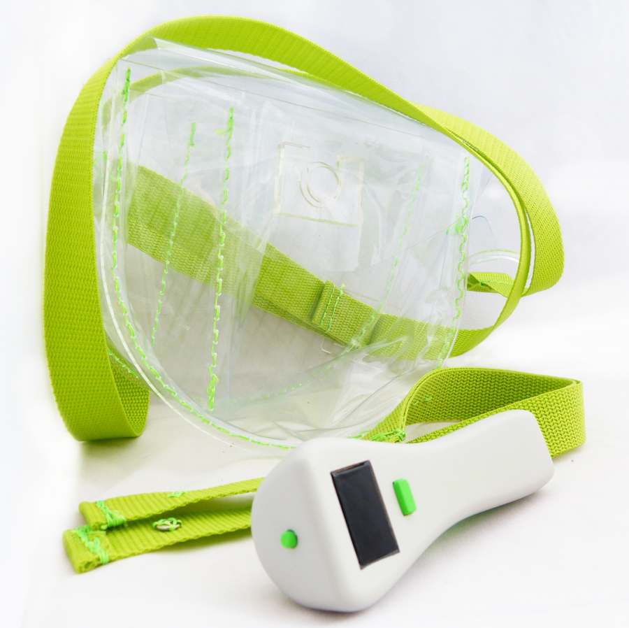 The bag is clear to allow the user to see how much they are picking, there is a section in the bag for the scale to be kept when not in use and an ajustable strap to allow the user to wear the bag across their body. The scale attached to the bag via the rings of the strap allowing the bag to fully suspend underneath for an accurate way to weigh the produce.