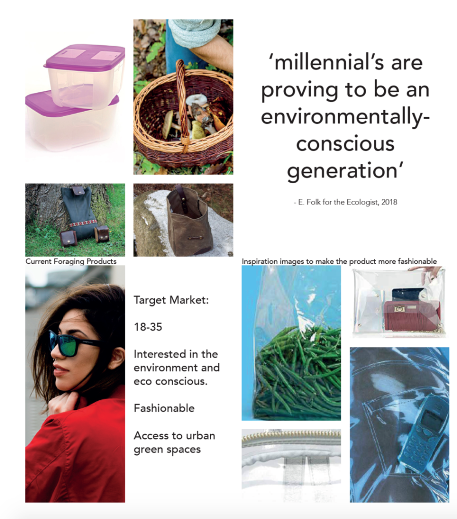 I wanted to aim my product at millenials, as millenials are the sustainable generation. For this I looked at making my product more fashionable, following a current trend of clear accessories I opted for Meliflex, a sustainable substitution for PVC, to make my product clear. This also aided the function as a user can see how much they are foraging through the bag.